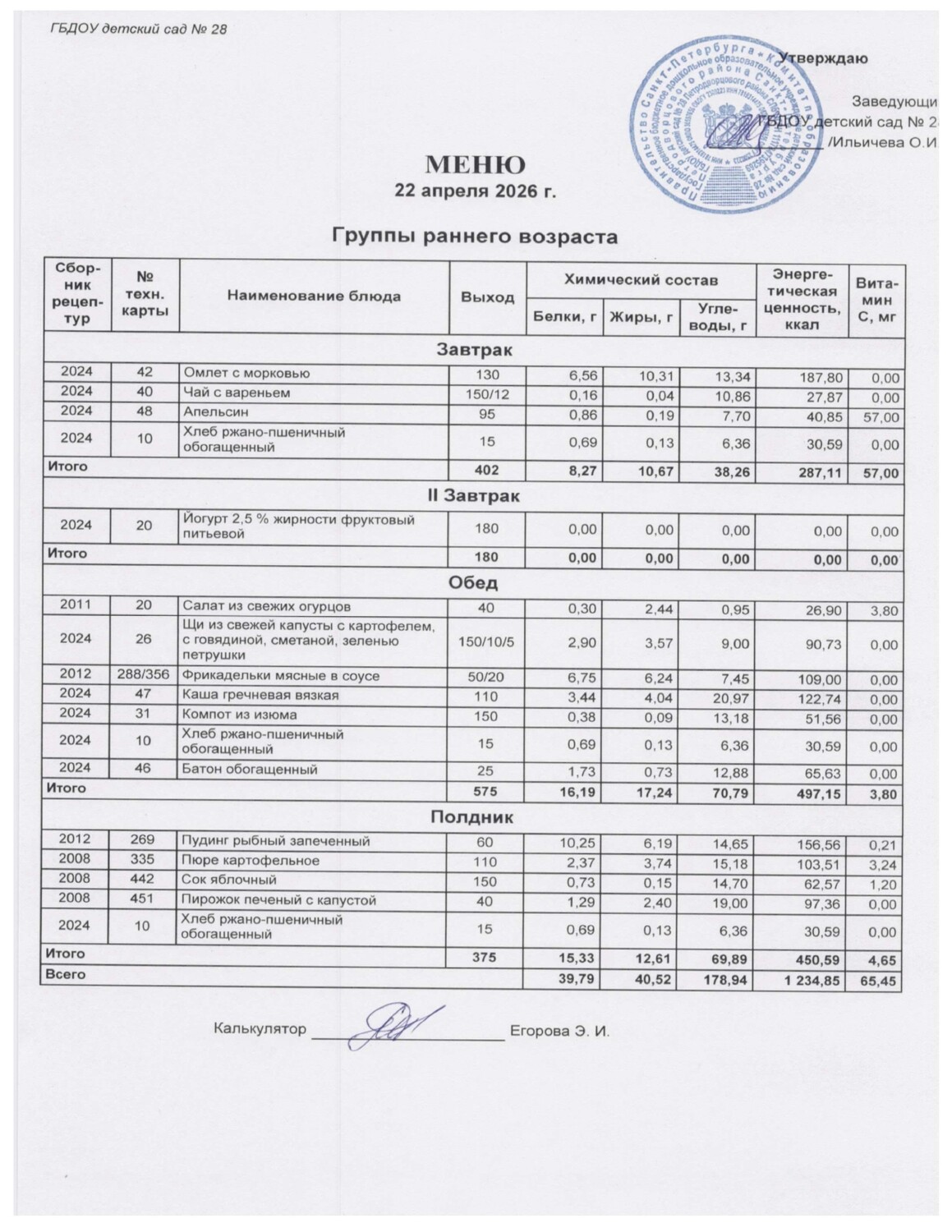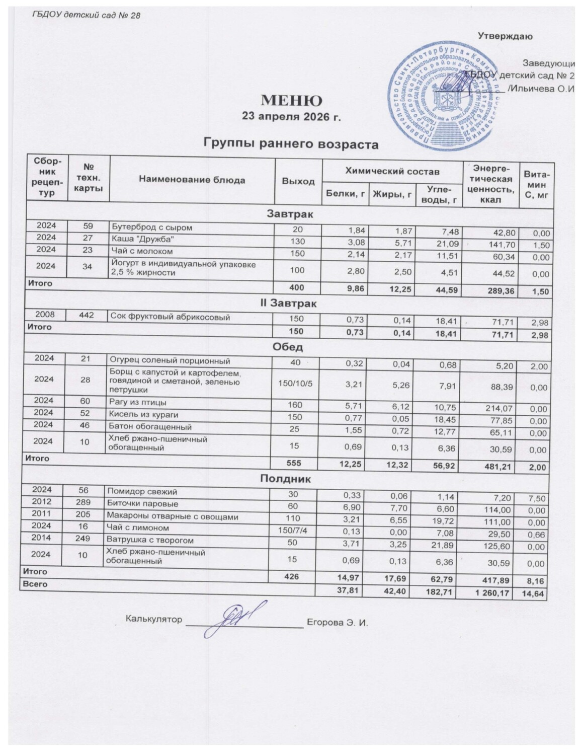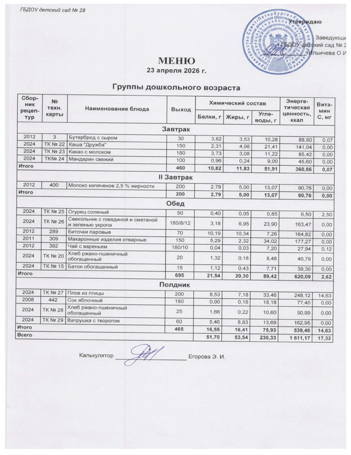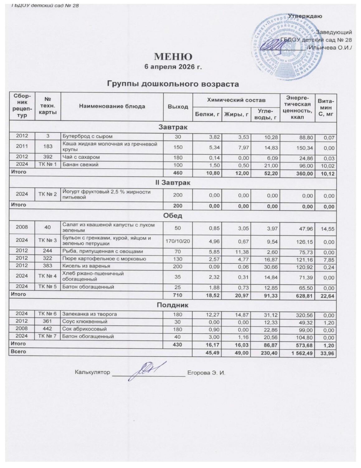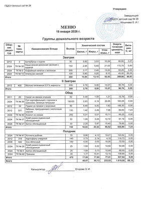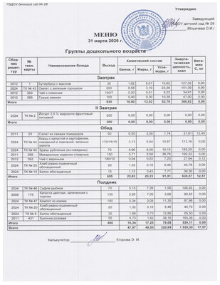 Питание организовано на основе цикличного 10-дневного меню для организации питания детей, утвержденного заведующим ГБДОУ детского сада № 28 Петродворцового района СПб. Цикличное десятидневное меню для организации питания детей в возрасте от 3 до 7 лет, посещающих с 12 часовым пребыванием дошкольные образовательные учреждения, в соответствии с физиологическими нормами потребления продуктов питания