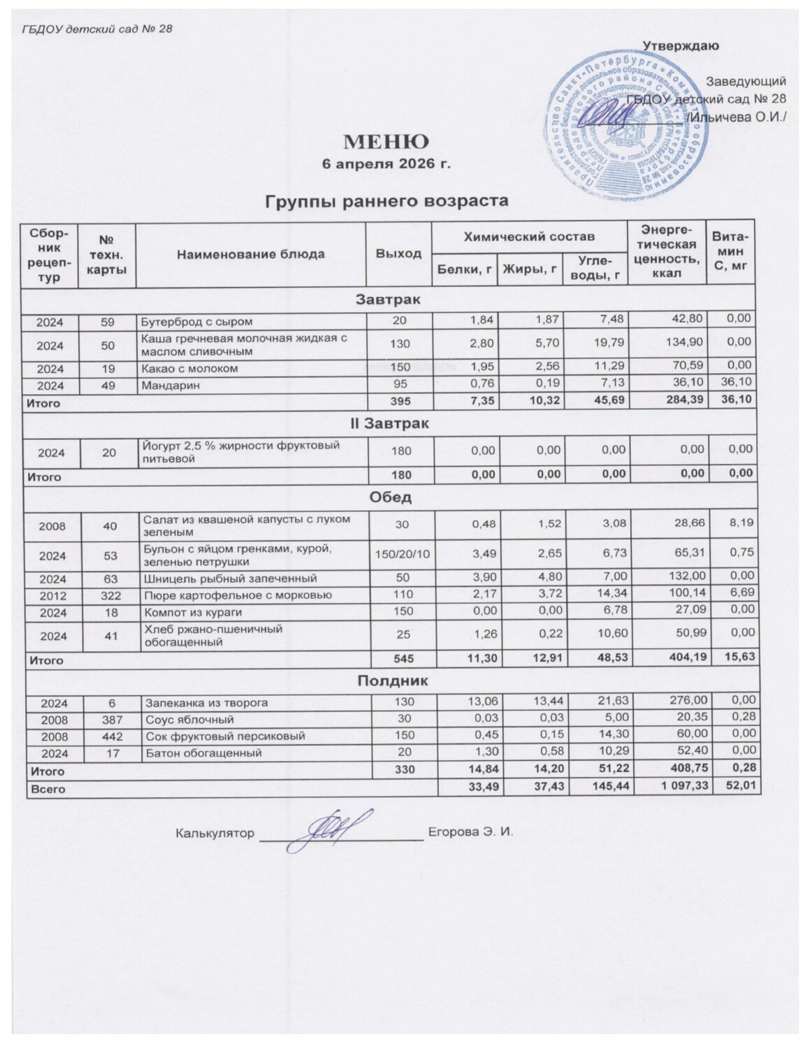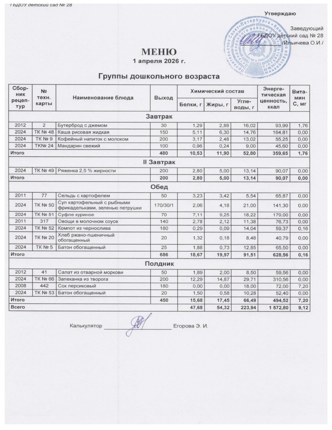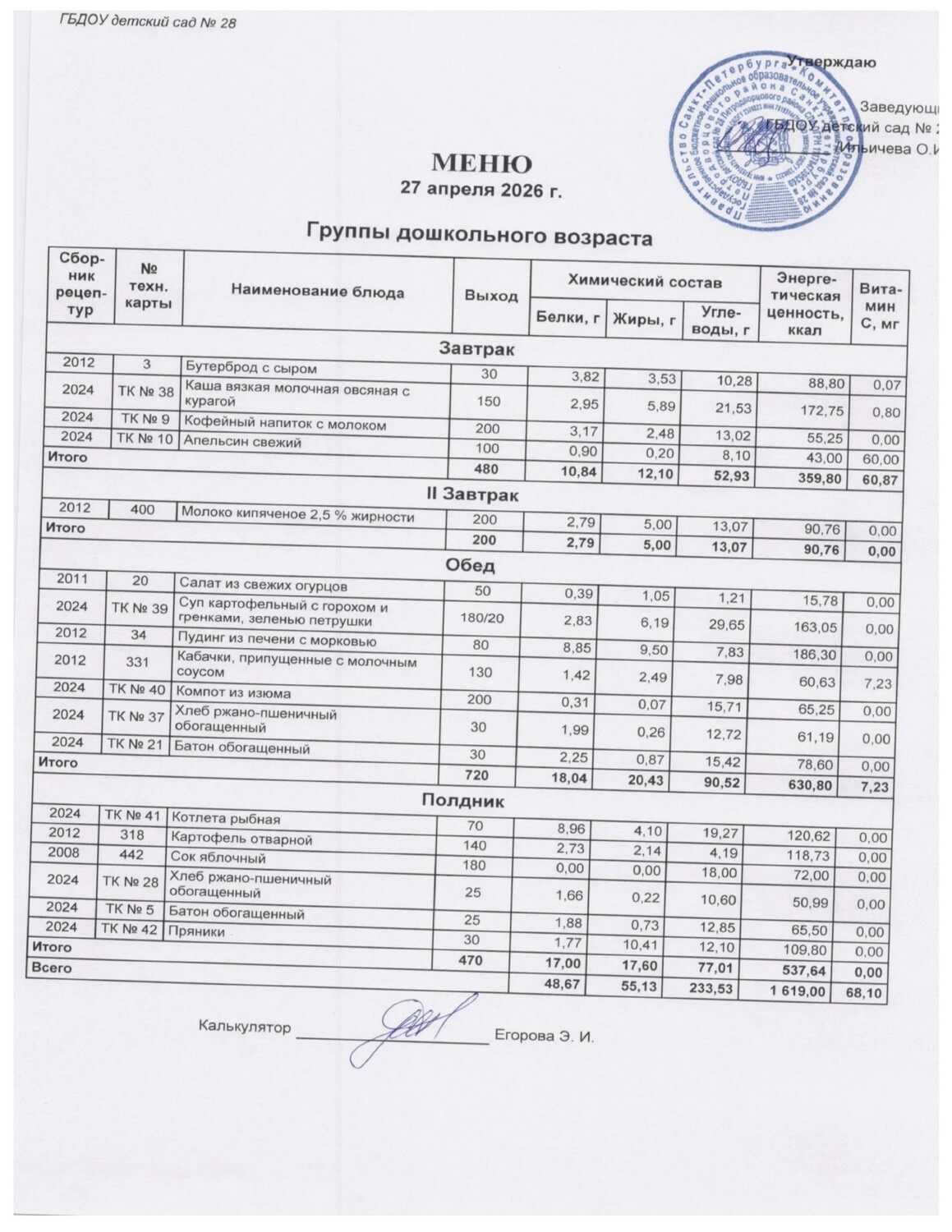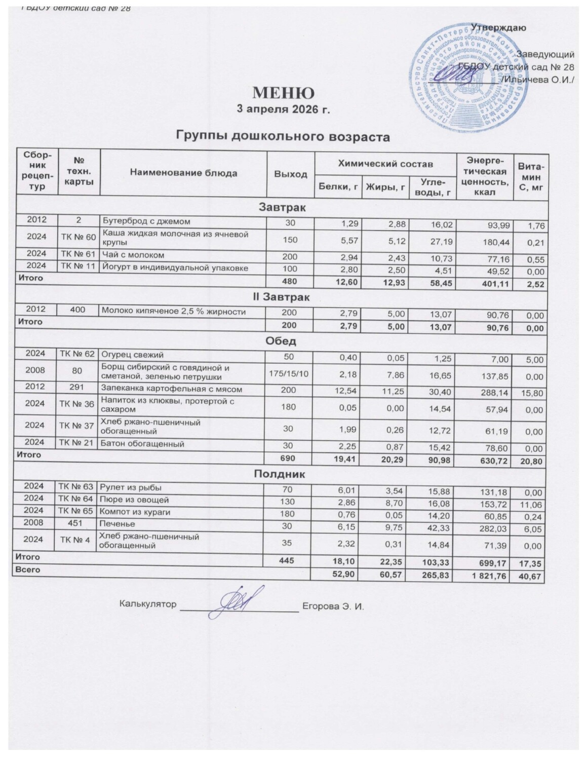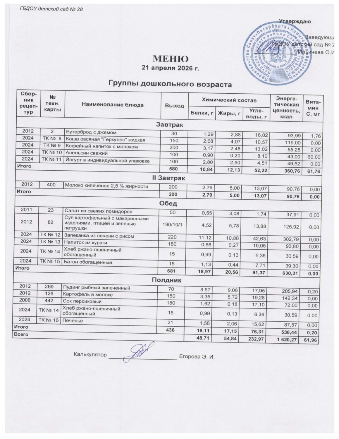 Питание организовано на основе цикличного 10-дневного меню для организации питания детей, утвержденного заведующим ГБДОУ детского сада № 28 Петродворцового района СПб. Цикличное десятидневное меню для организации питания детей в возрасте от 3 до 7 лет, посещающих с 12 часовым пребыванием дошкольные образовательные учреждения, в соответствии с физиологическими нормами потребления продуктов питания