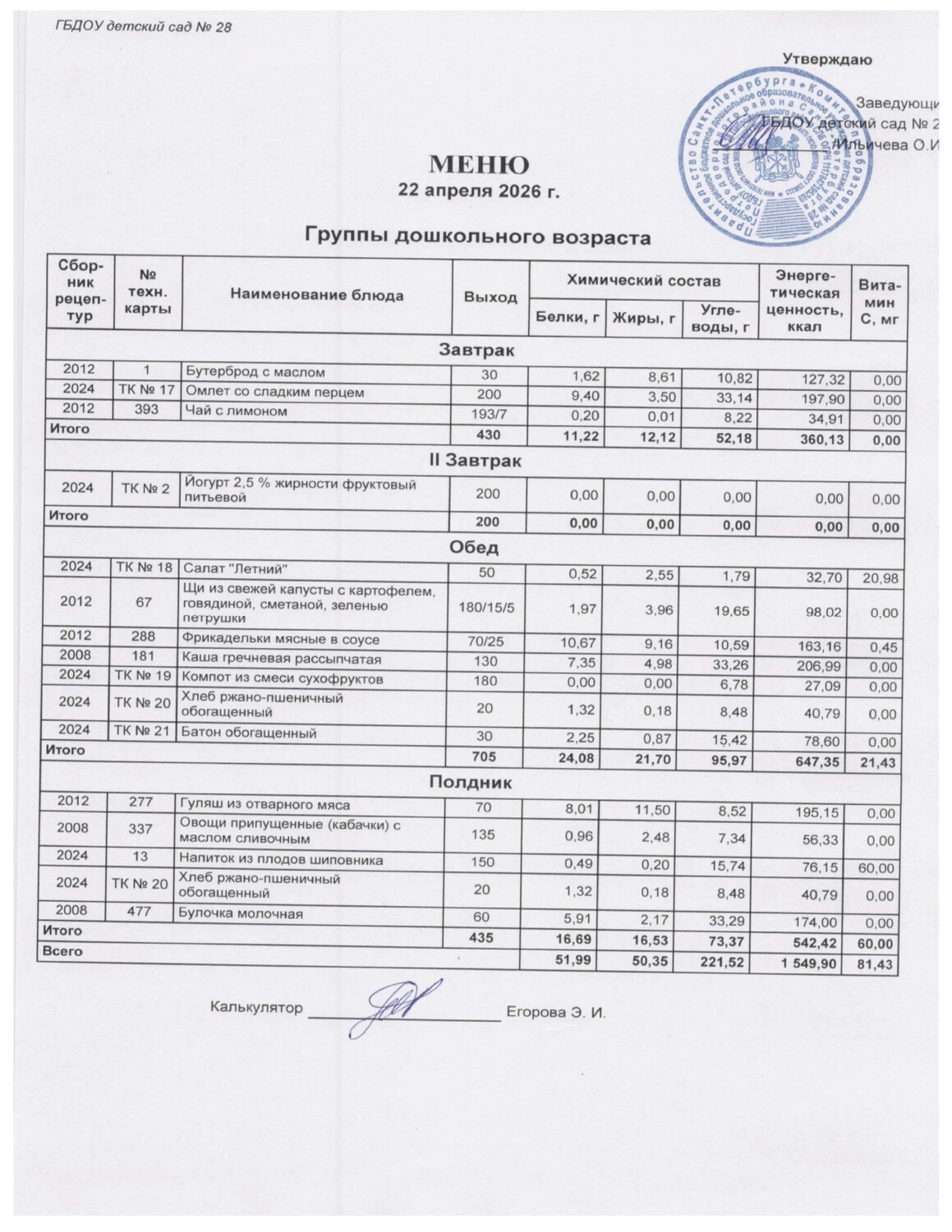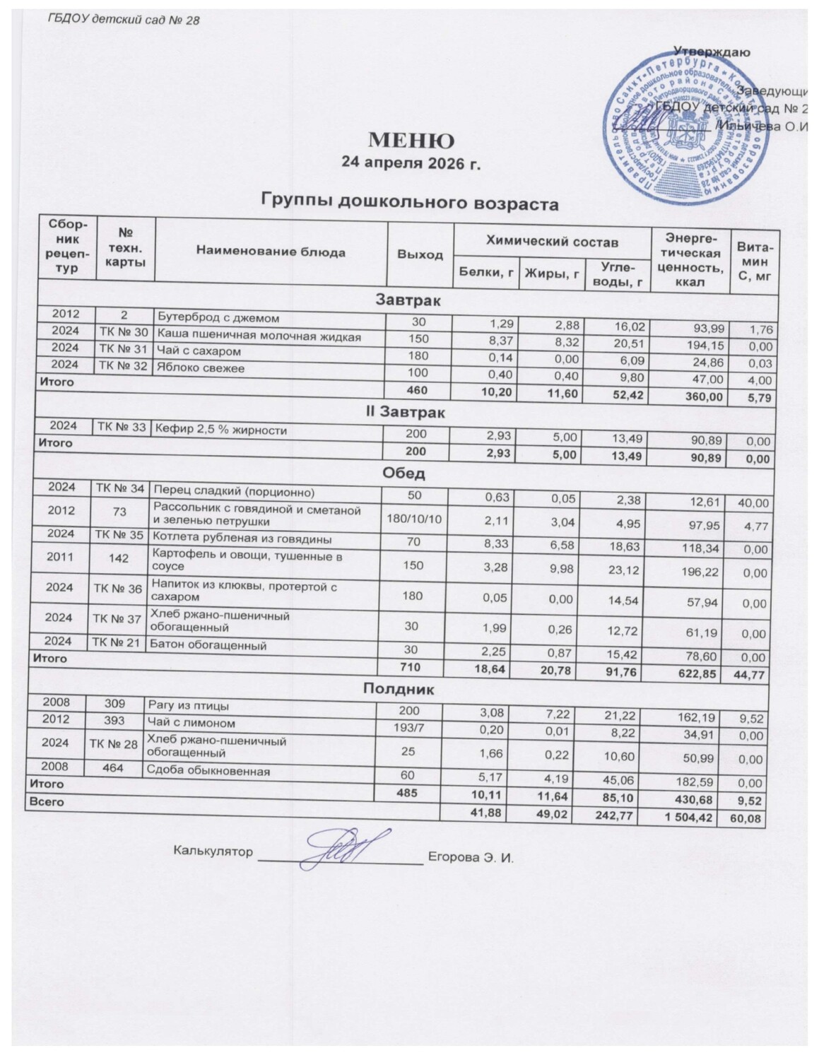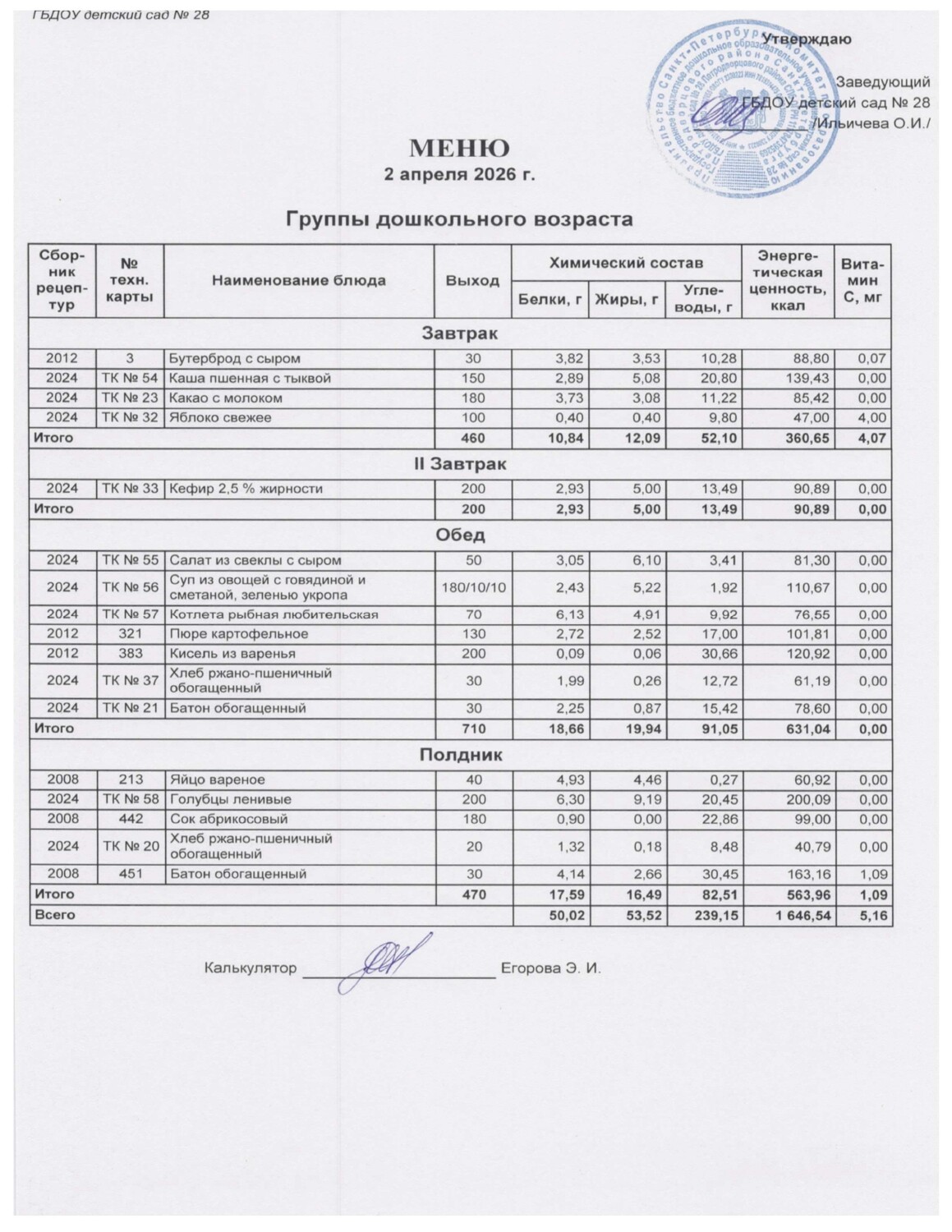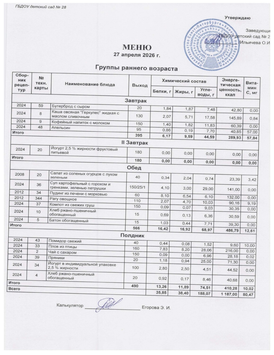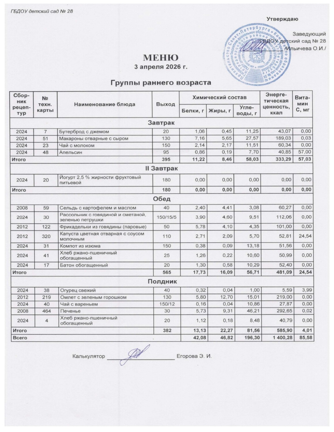 Питание организовано на основе цикличного 10-дневного меню для организации питания детей, утвержденного заведующим ГБДОУ детского сада № 28 Петродворцового района СПб. Цикличное десятидневное меню для организации питания детей в возрасте от 3 до 7 лет, посещающих с 12 часовым пребыванием дошкольные образовательные учреждения, в соответствии с физиологическими нормами потребления продуктов питания
