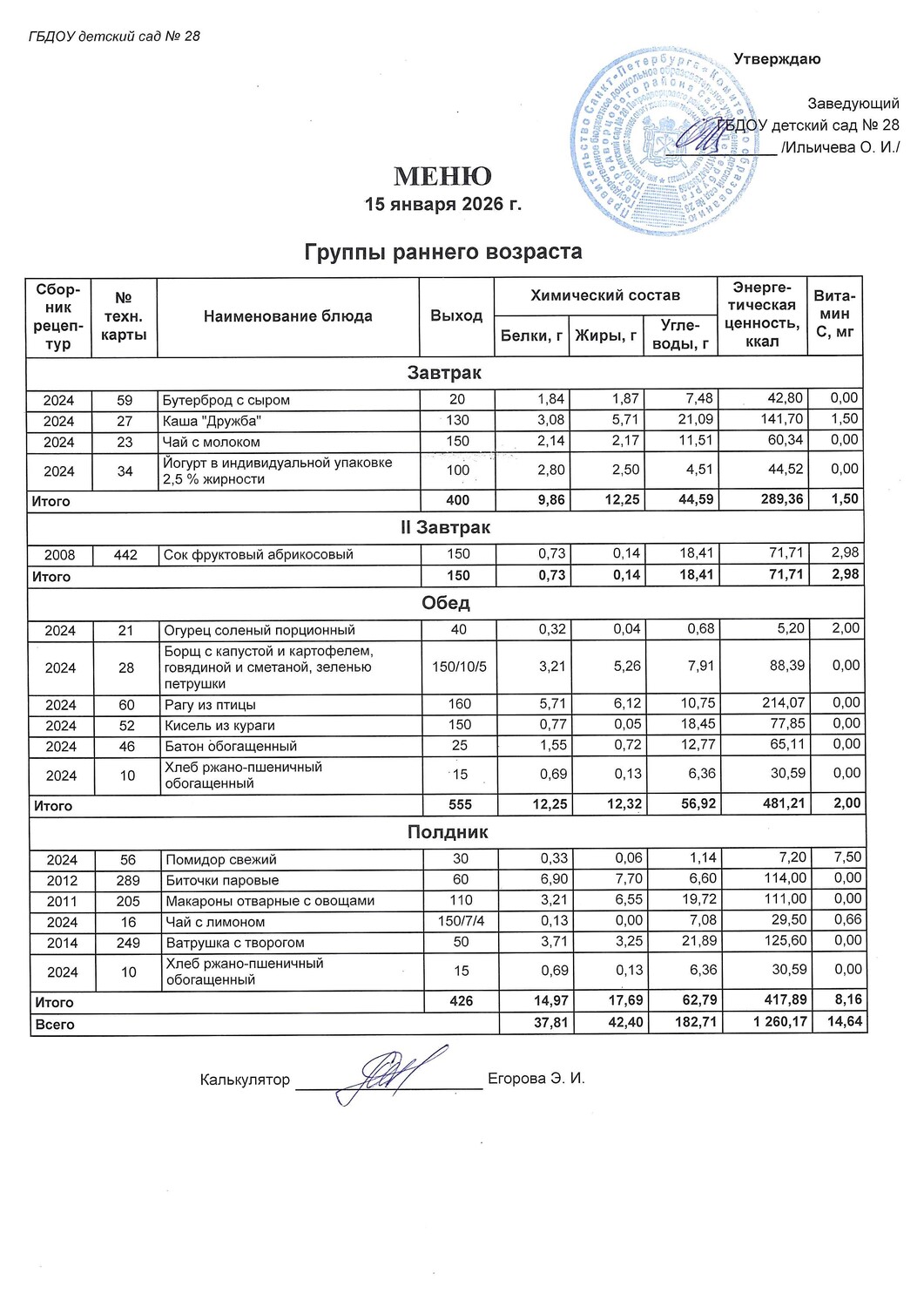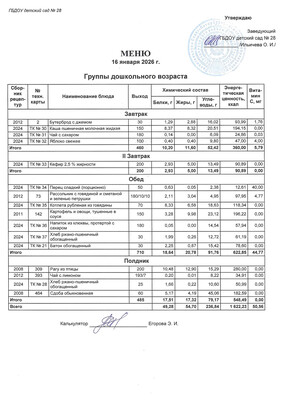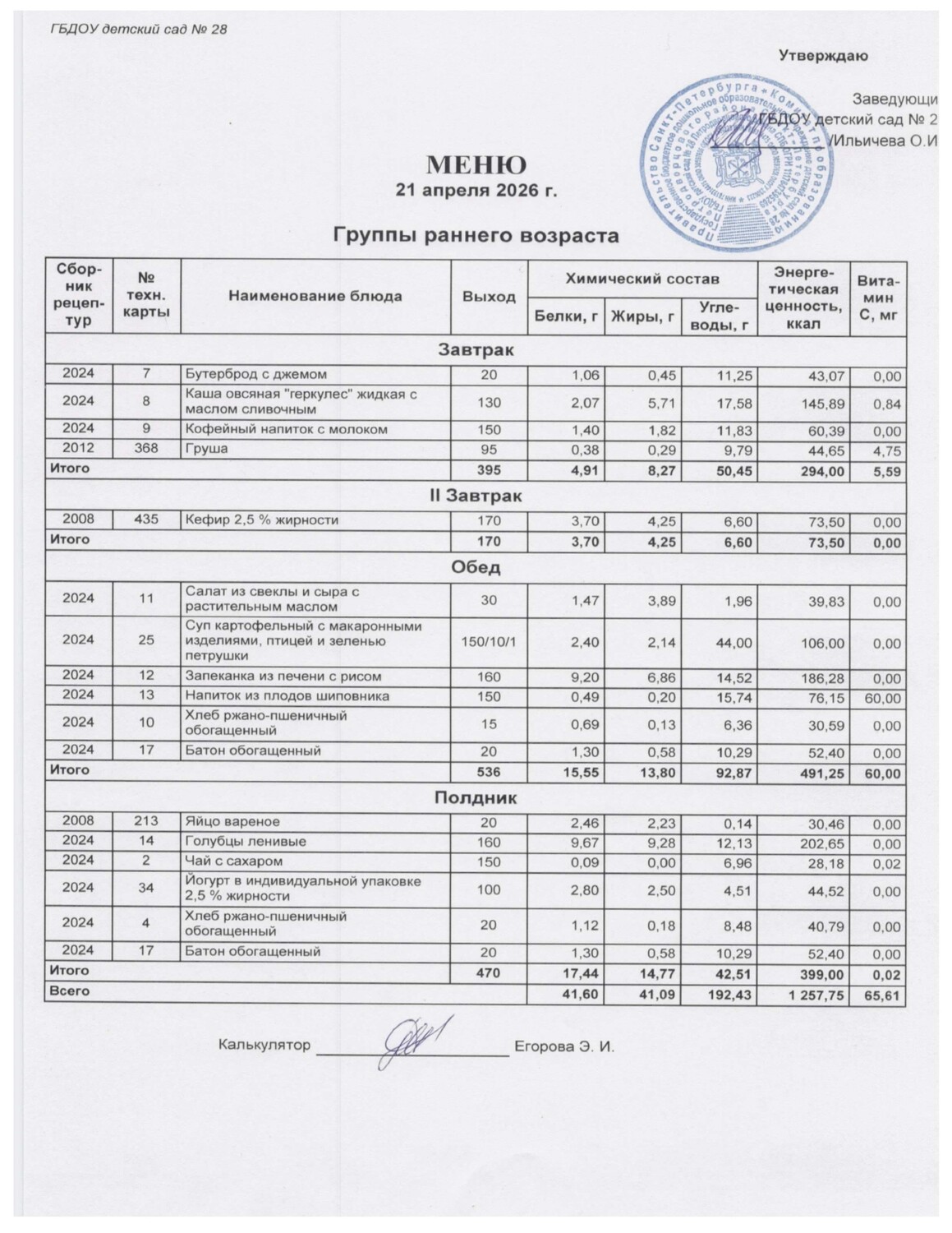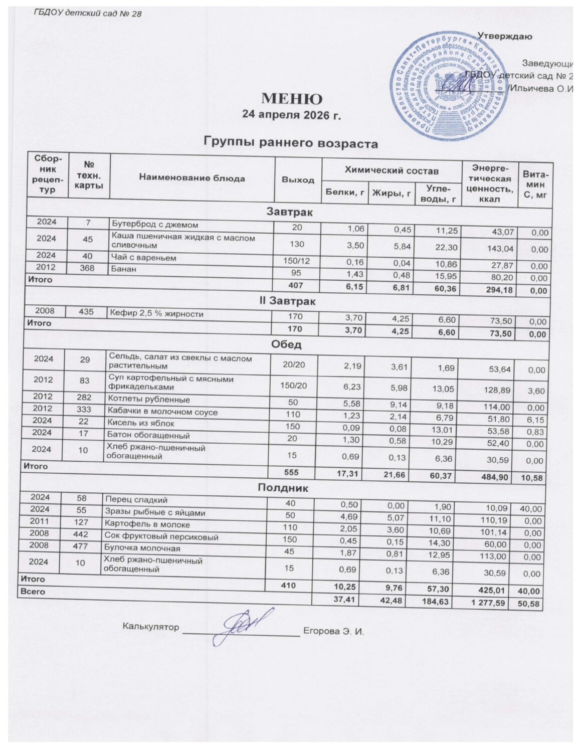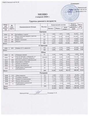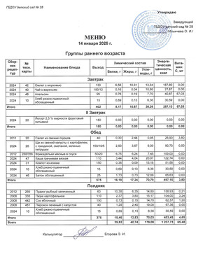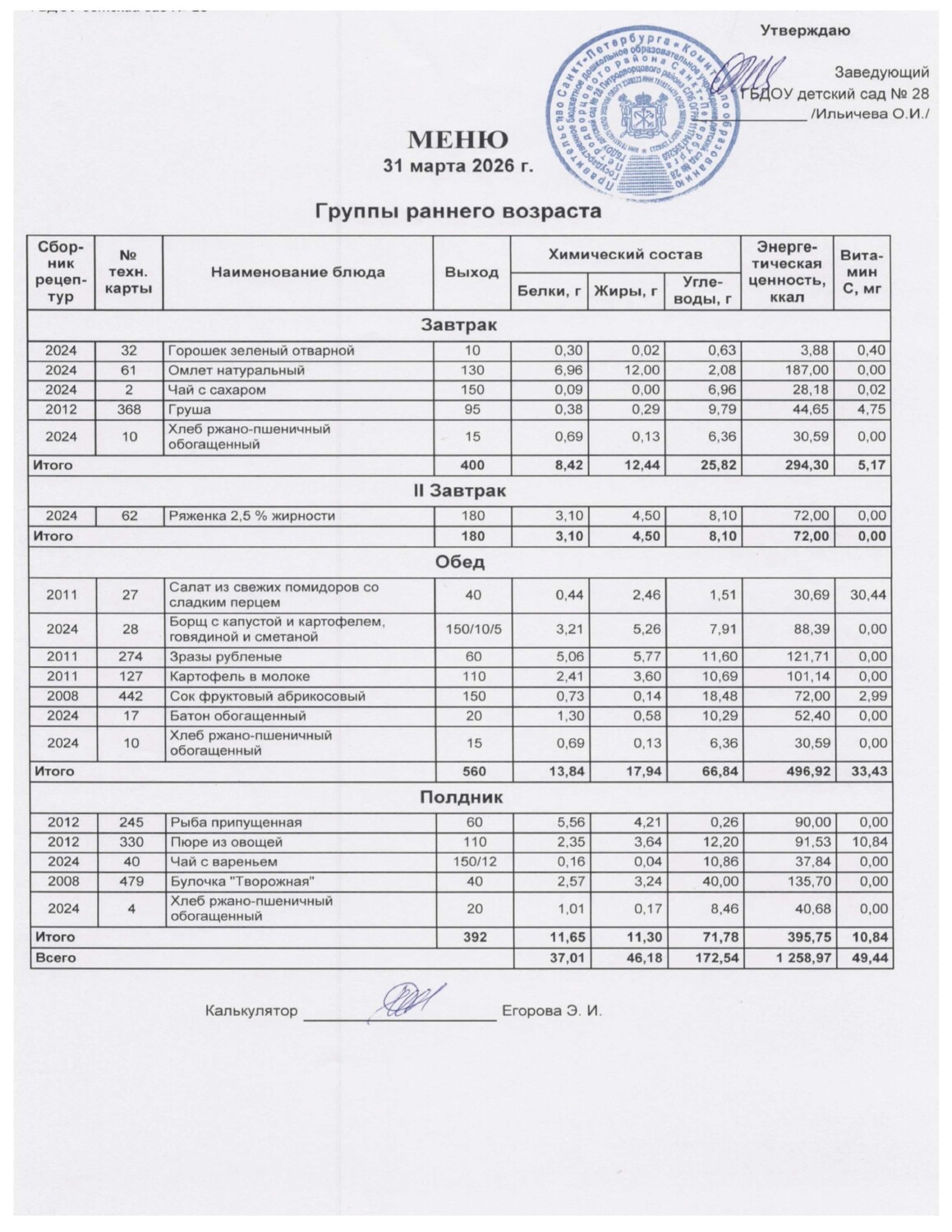 Питание организовано на основе цикличного 10-дневного меню для организации питания детей, утвержденного заведующим ГБДОУ детского сада № 28 Петродворцового района СПб. Цикличное десятидневное меню для организации питания детей в возрасте от 3 до 7 лет, посещающих с 12 часовым пребыванием дошкольные образовательные учреждения, в соответствии с физиологическими нормами потребления продуктов питания