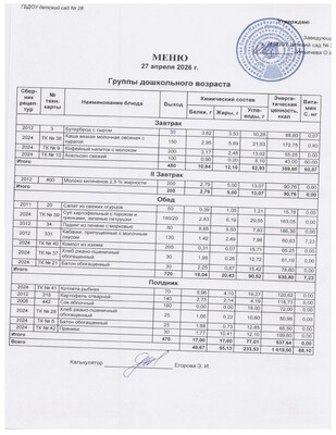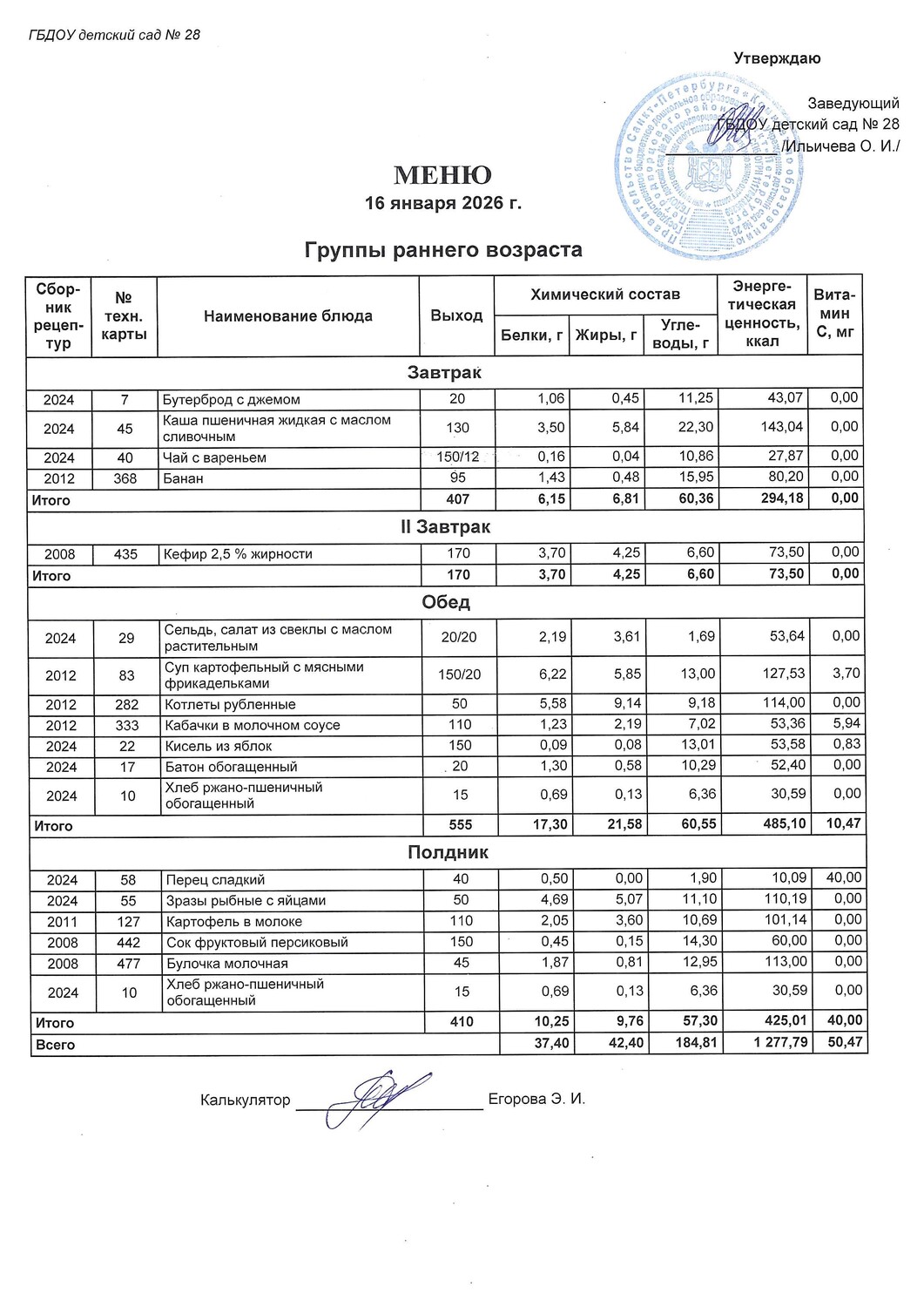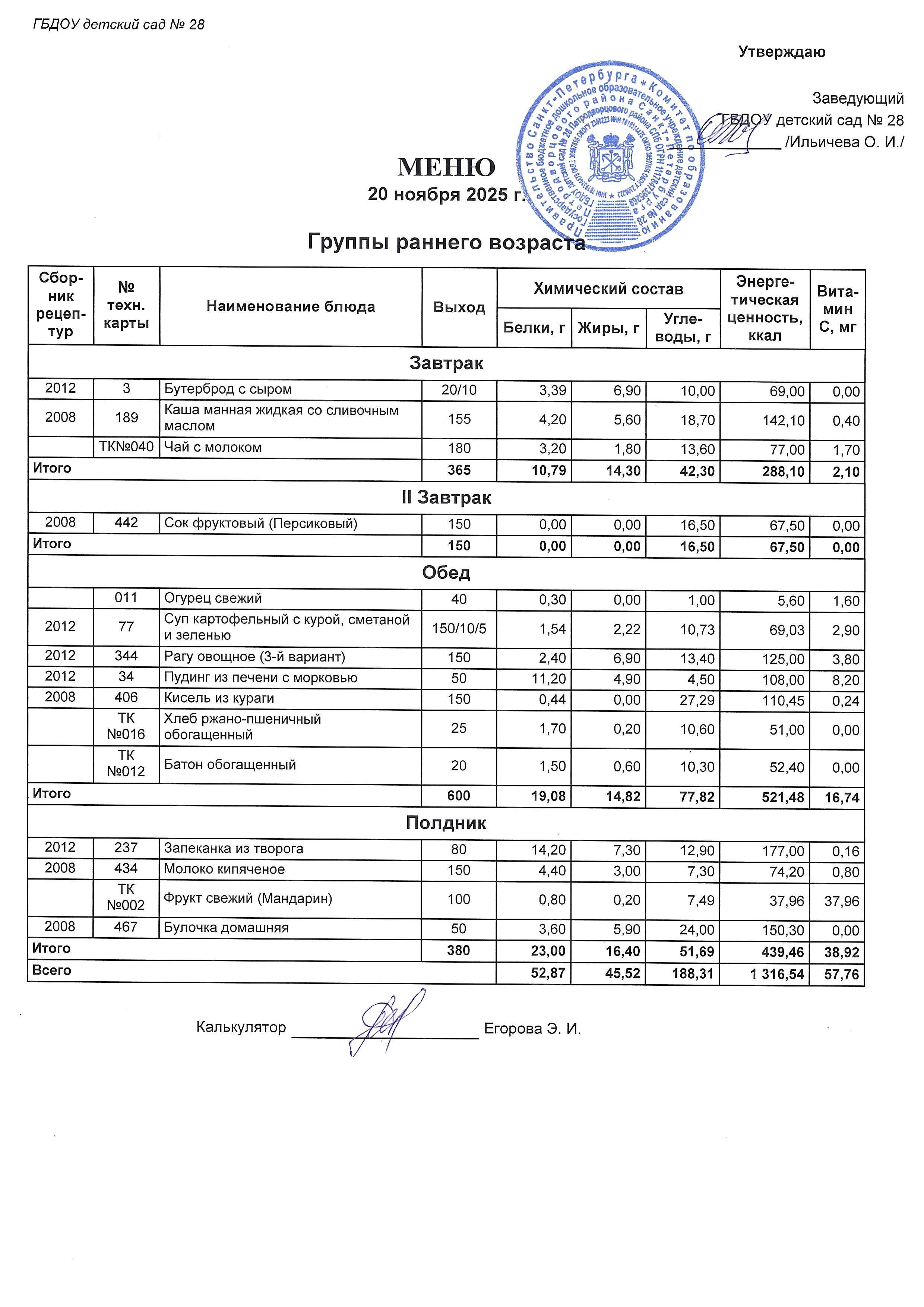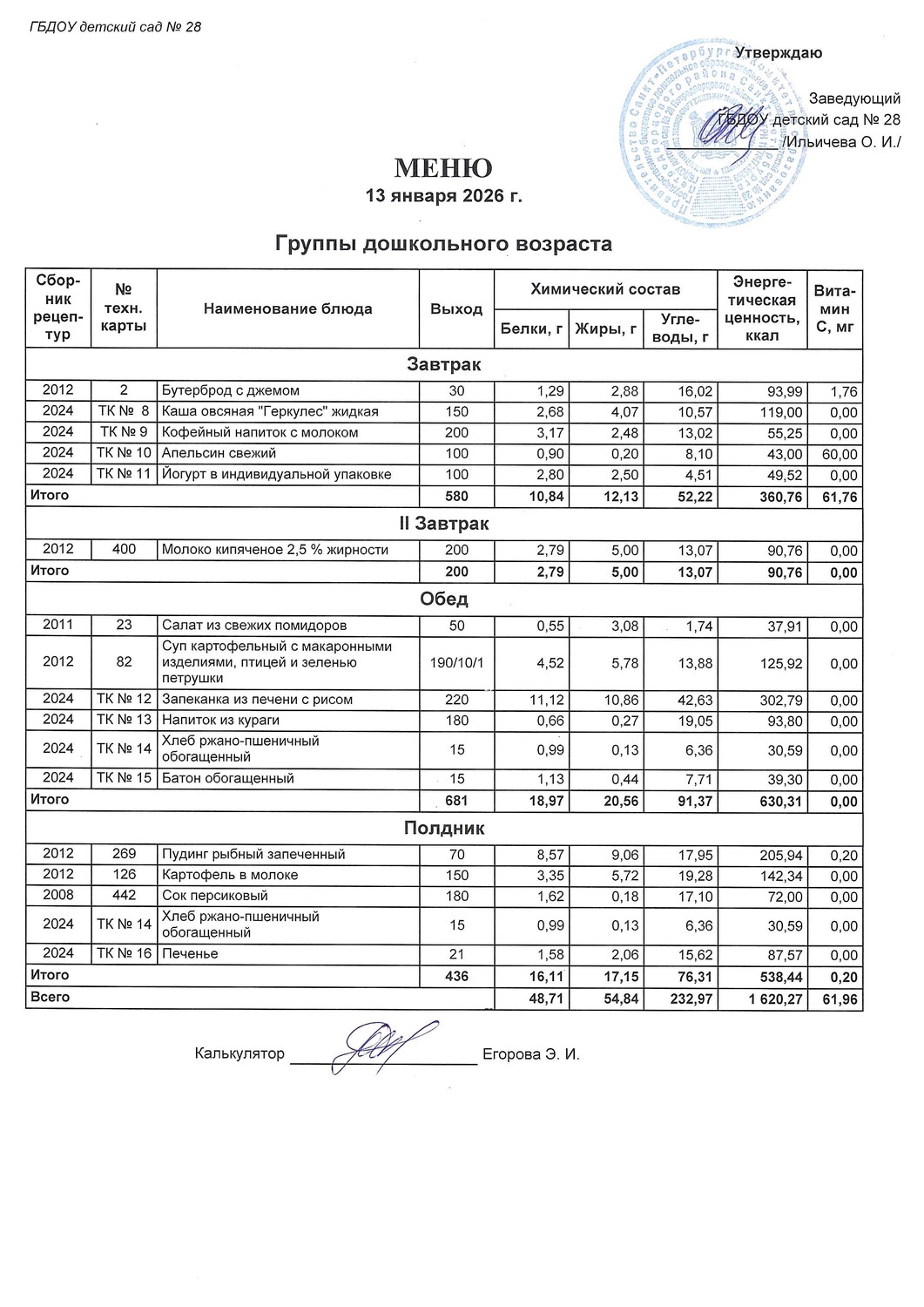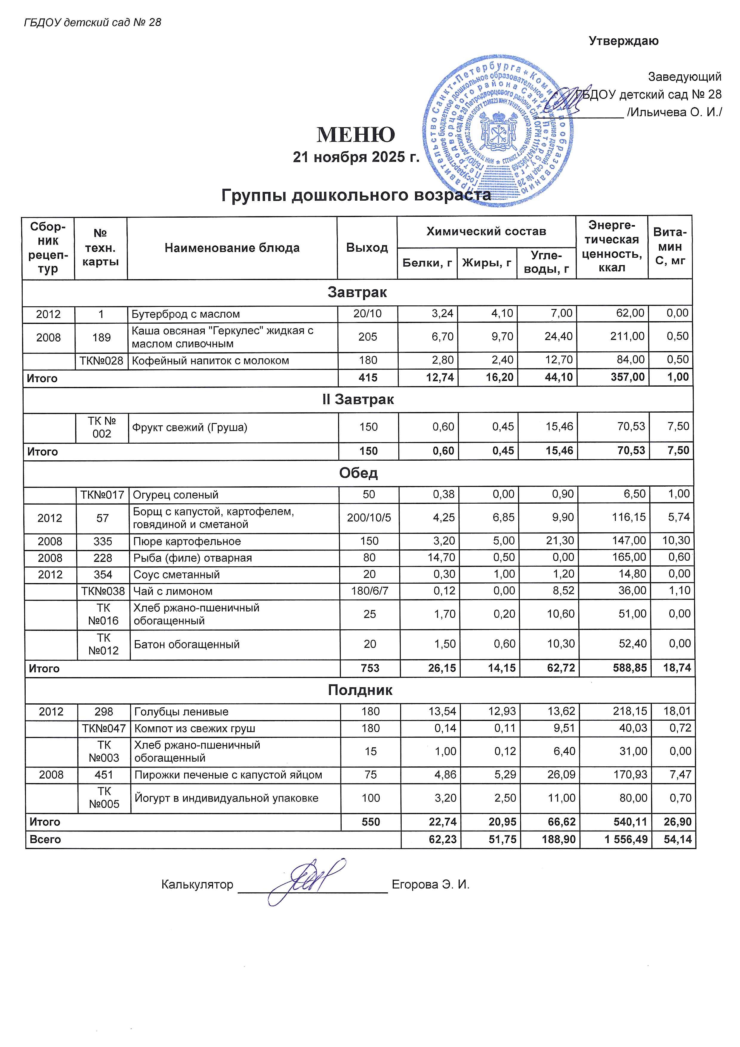 Питание организовано на основе цикличного 10-дневного меню для организации питания детей, утвержденного заведующим ГБДОУ детского сада № 28 Петродворцового района СПб. Цикличное десятидневное меню для организации питания детей в возрасте от 3 до 7 лет, посещающих с 12 часовым пребыванием дошкольные образовательные учреждения, в соответствии с физиологическими нормами потребления продуктов питания