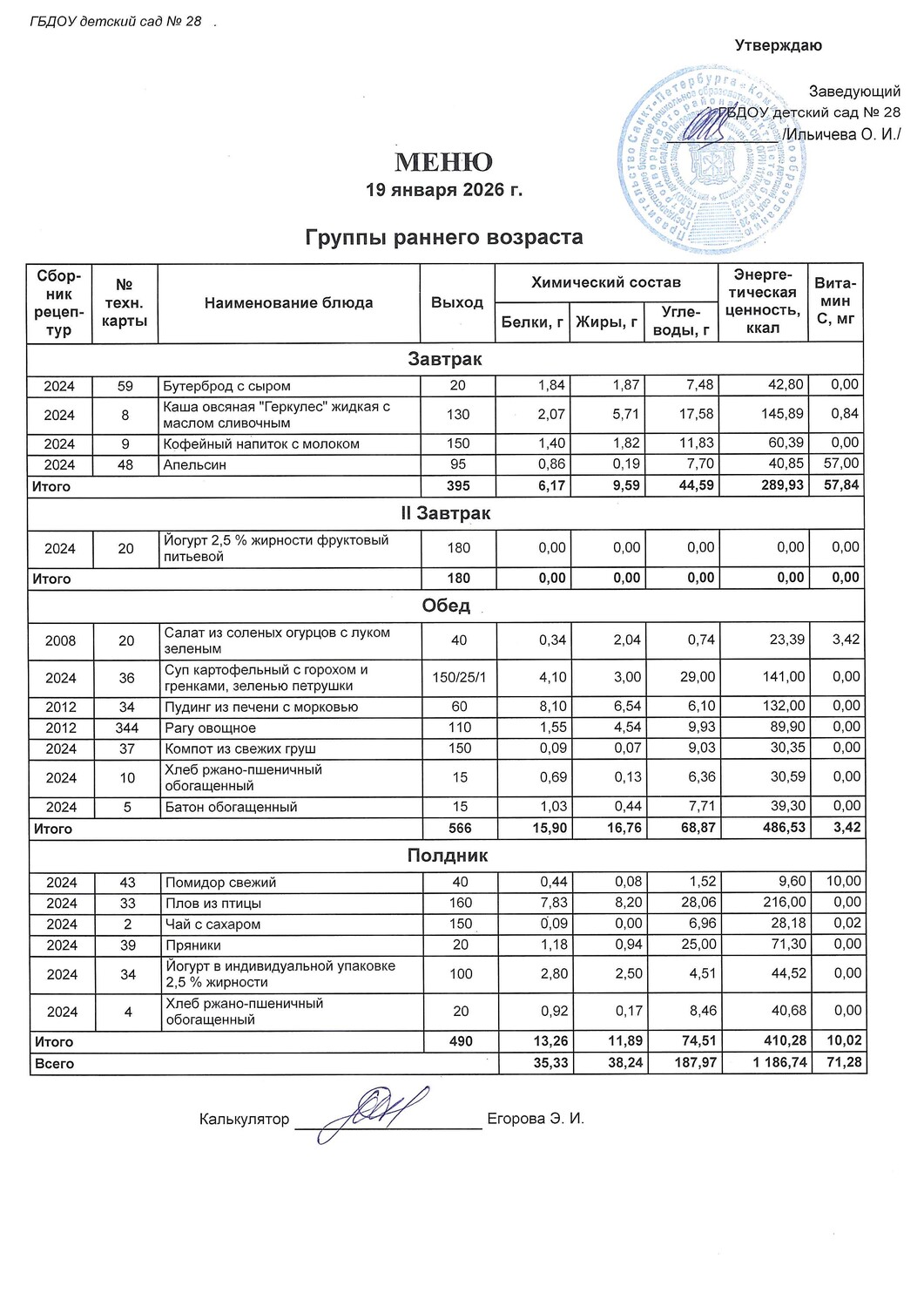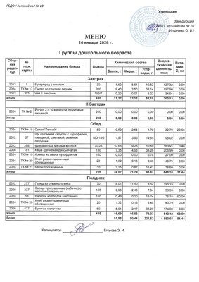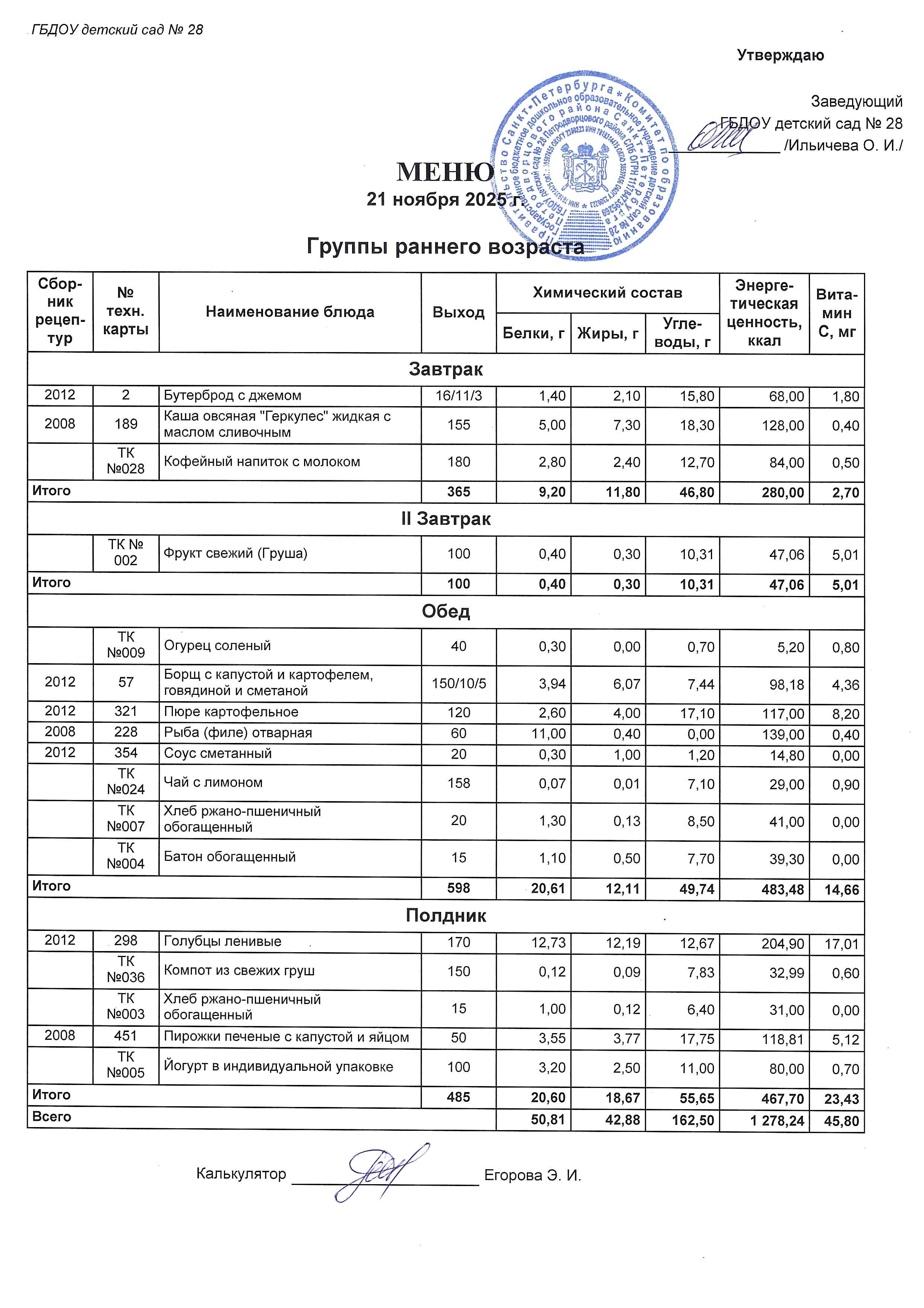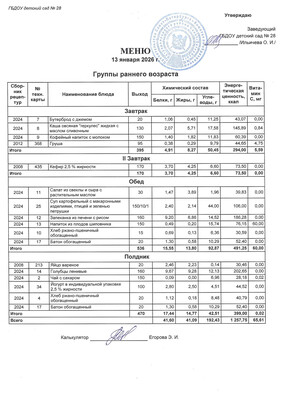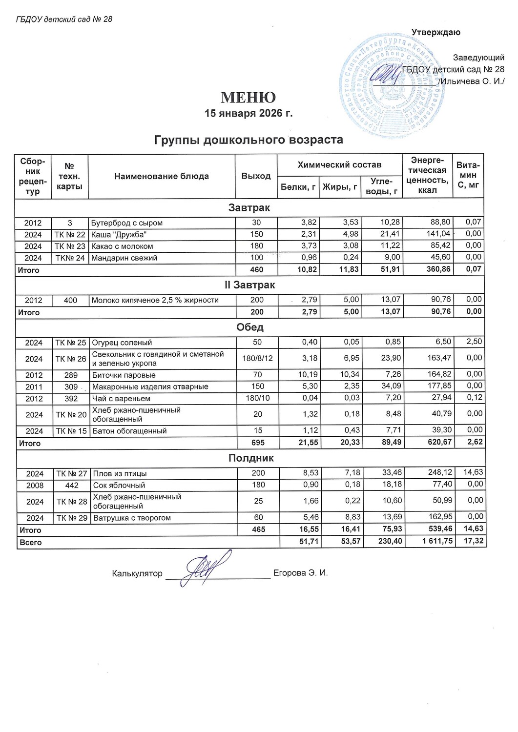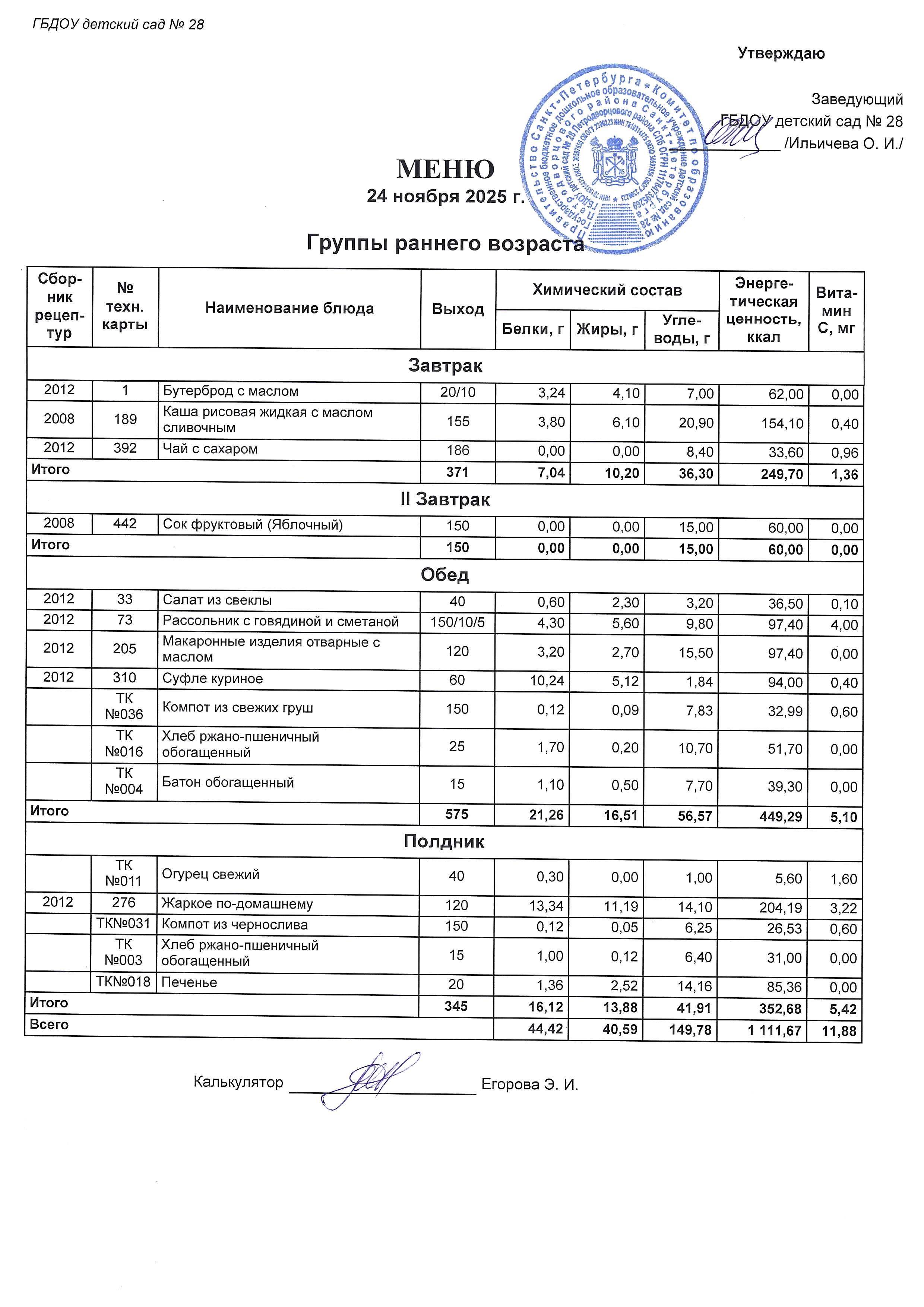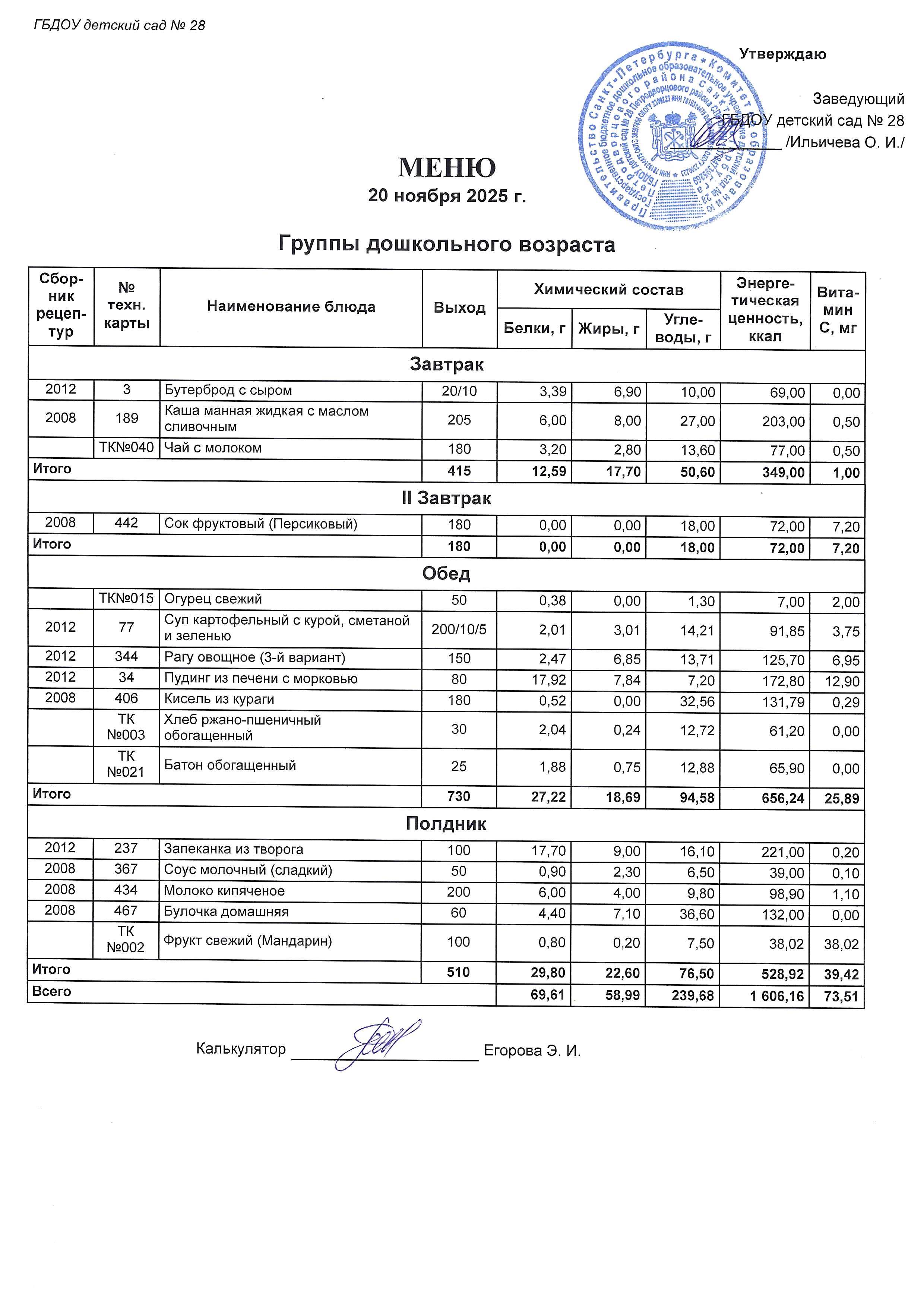 Питание организовано на основе цикличного 10-дневного меню для организации питания детей, утвержденного заведующим ГБДОУ детского сада № 28 Петродворцового района СПб. Цикличное десятидневное меню для организации питания детей в возрасте от 3 до 7 лет, посещающих с 12 часовым пребыванием дошкольные образовательные учреждения, в соответствии с физиологическими нормами потребления продуктов питания