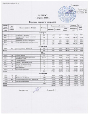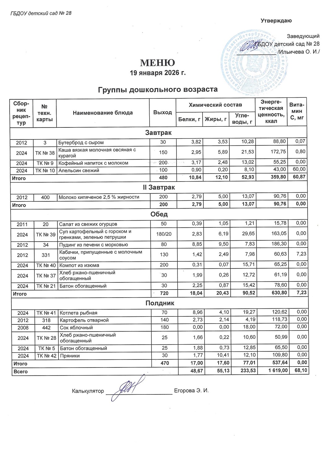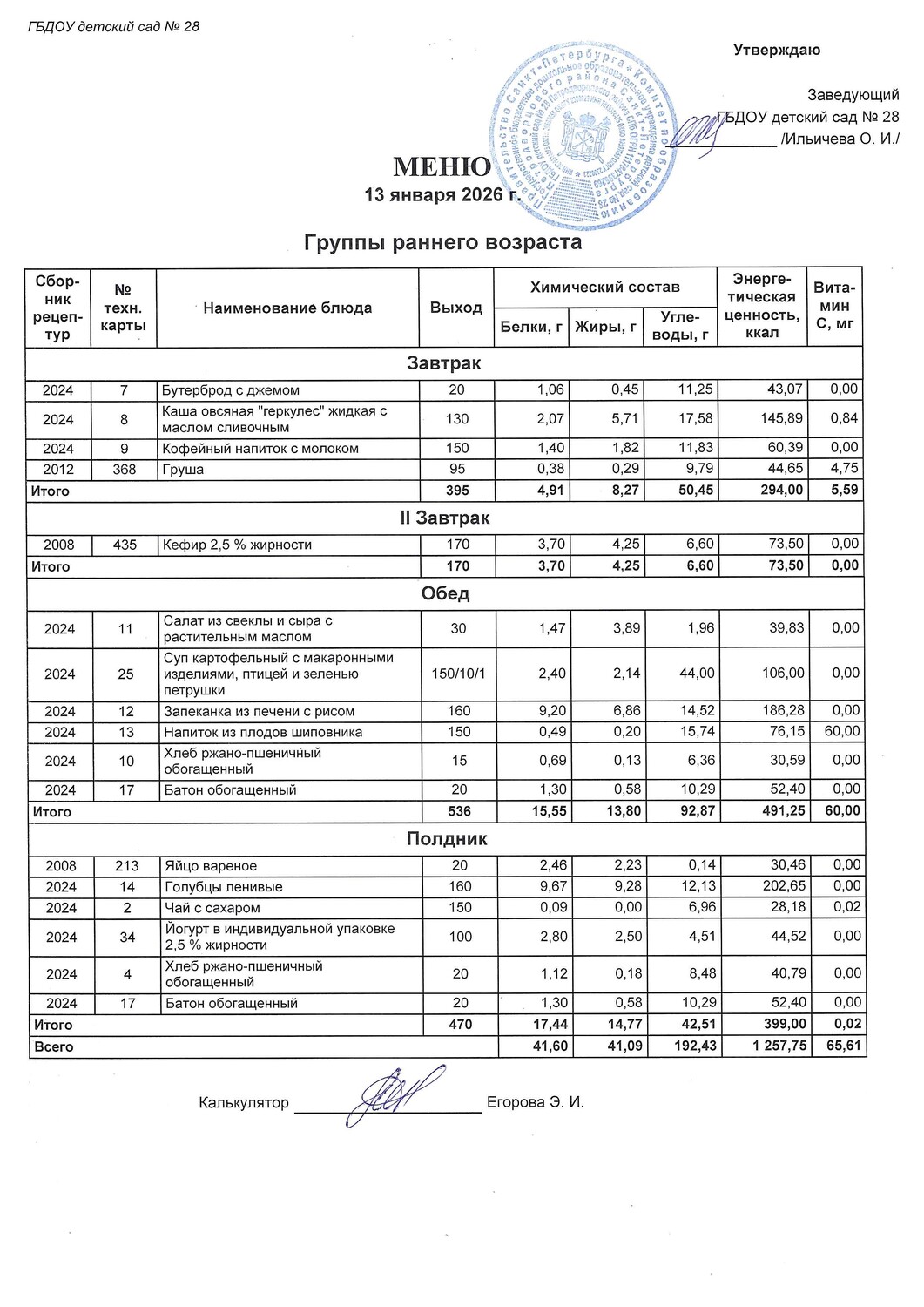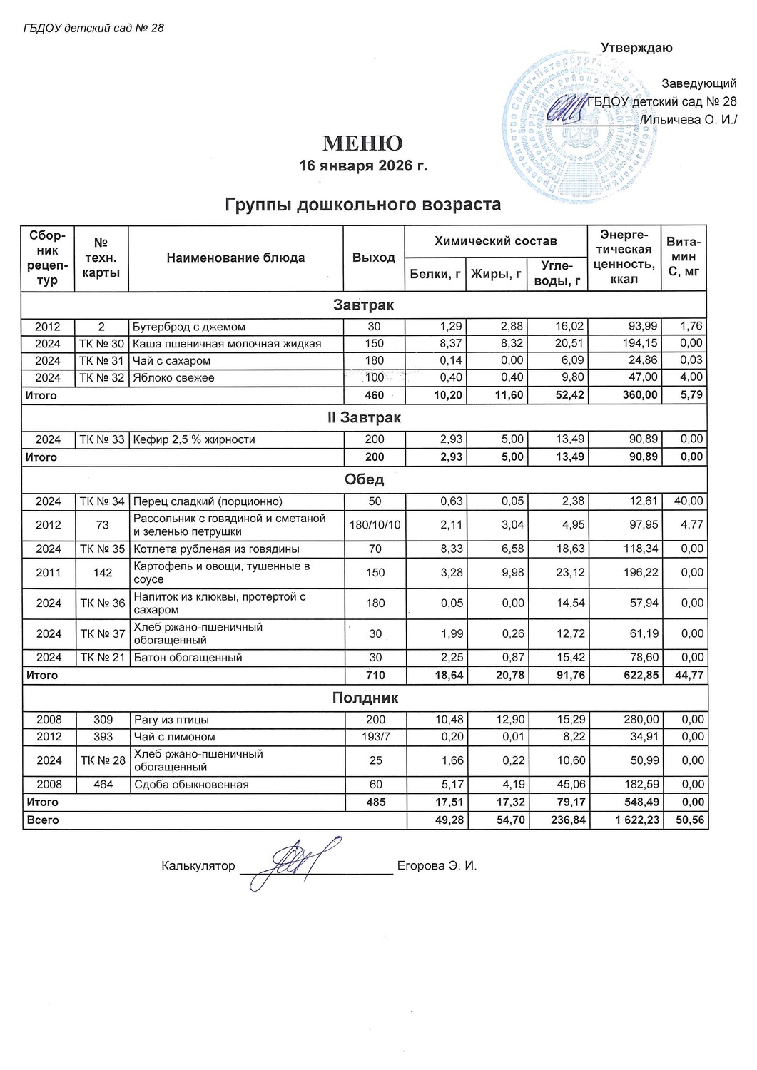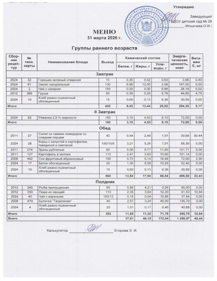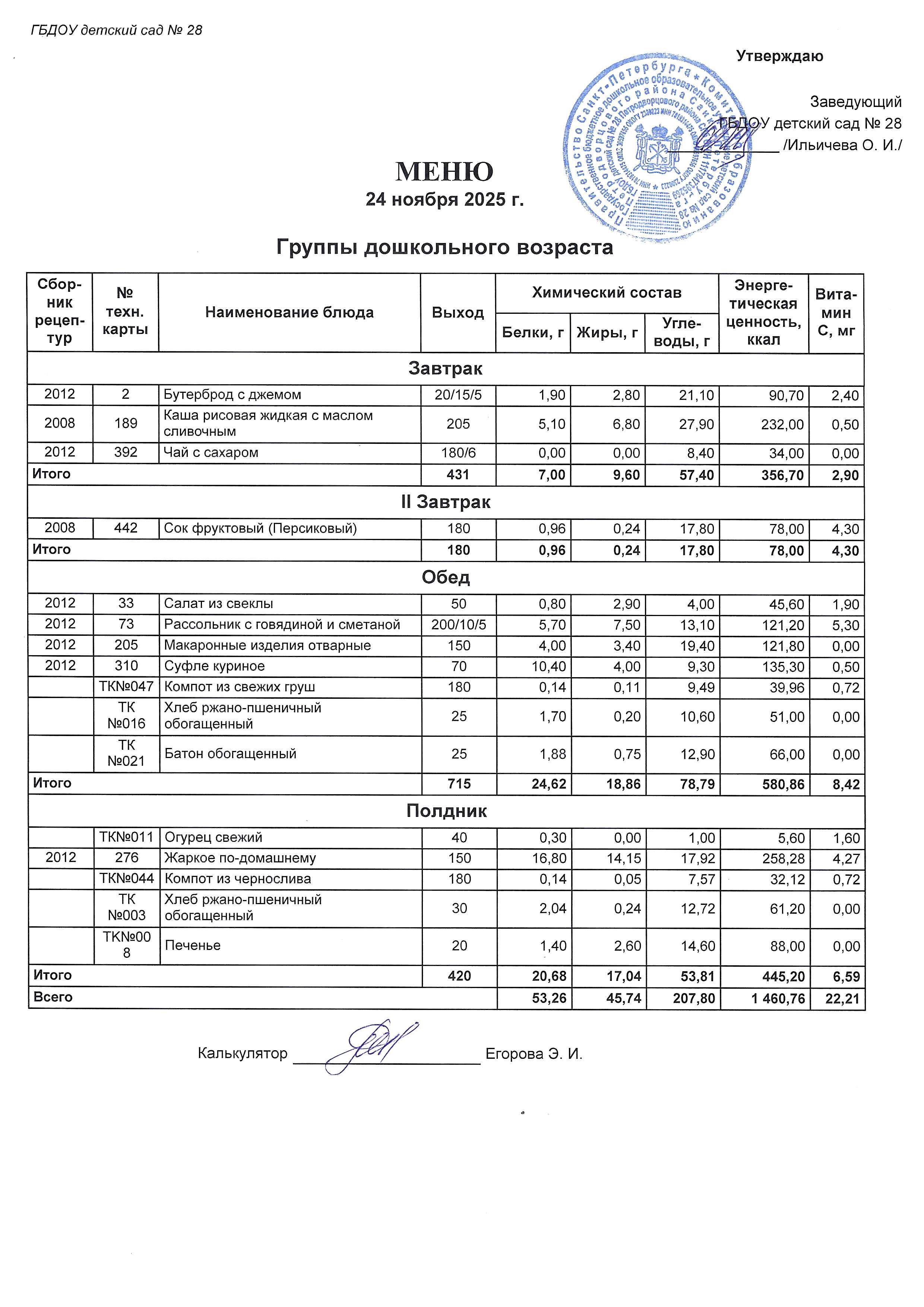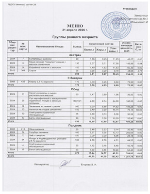Питание организовано на основе цикличного 10-дневного меню для организации питания детей, утвержденного заведующим ГБДОУ детского сада № 28 Петродворцового района СПб. Цикличное десятидневное меню для организации питания детей в возрасте от 3 до 7 лет, посещающих с 12 часовым пребыванием дошкольные образовательные учреждения, в соответствии с физиологическими нормами потребления продуктов питания